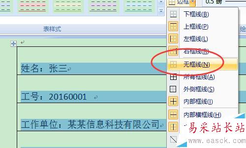 13、我們選中表格,在設(shè)計選項卡中,在邊框中先選擇無框線。