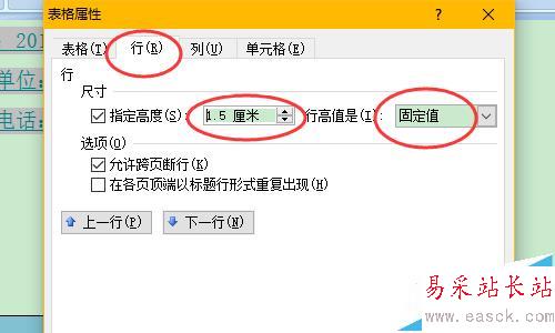 10、在表格屬性對話框中,將行高設(shè)置成1.5厘米