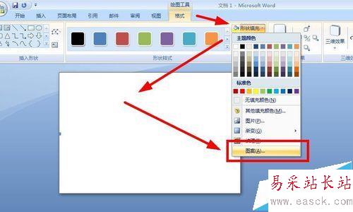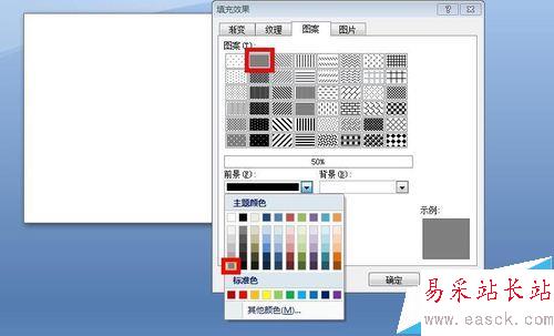 6、點擊“格式”--“形狀樣式”--“形狀填充”,在彈出的下拉菜單中選擇“圖案”,在彈出的對話框中,單擊“圖案”選項卡,在“圖案”的中間區域選擇第二個樣式圖案,如圖框選,單擊“前景”下拉按鈕,選擇“灰色”,如圖框選,然后單擊“確定”,效果如圖。