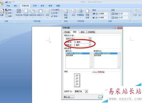 2、我們在彈出的對話框中選擇“紙張”,將“紙張”的寬與高設置為:12厘米和8厘米,點擊確定,效果如圖。