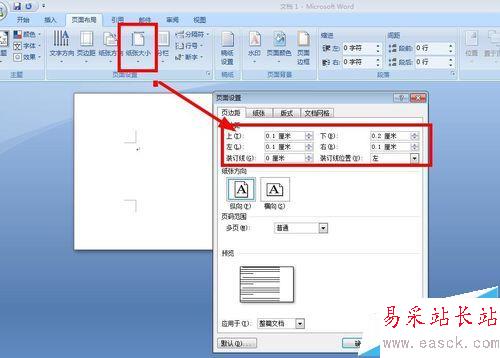 3、調整邊距,再次選擇紙“張選“項卡,單擊“頁邊距”選項卡,將頁邊距的上、下、左、右分別設置為0.1、0.2、0.1、0.1厘米,然后單擊“確定”,效果如圖。
