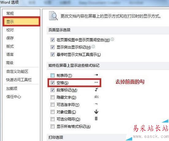 2.進(jìn)入word選項(xiàng)之后,單擊左側(cè)的“顯示”那一項(xiàng),在右邊找到“空格”那一項(xiàng),去掉“空格“前面的勾即可
