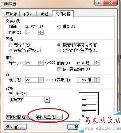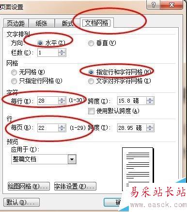5、我們現在正點擊到文檔網絡選項。文字排列方向選擇水平。網格要選擇指定行和字符網絡,每行28個字。每頁22行。