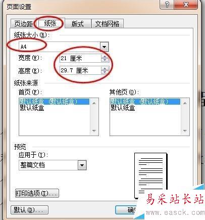 3、一般公文都是用A4紙,我們在頁面設置中的紙張選擇可以選擇A4紙,寬度和高度可以按下圖的標準設置。