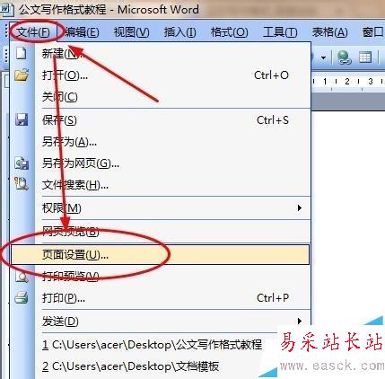 2、在左上角用鼠標點擊文件按鈕,再點擊頁面設置。打開我們的頁面設置窗口。具體操作順序可以看下圖