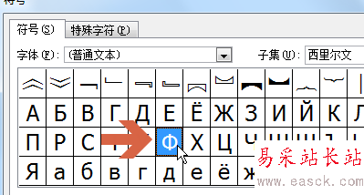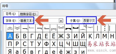 3、符號項目中的字體選擇“普通文本”,子集選擇“西里爾文”。