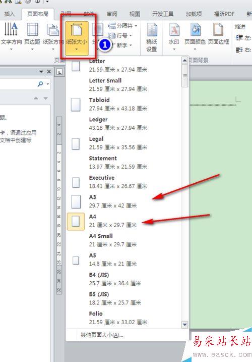 2、點擊【紙張大小】,如下圖,下拉菜單中選擇你想要的紙張大小,如A3,A4等
