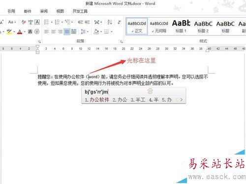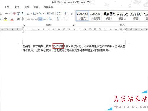 2、現(xiàn)在我們要做的是把第一行括號(hào)內(nèi)的“word”字樣,換成“辦公軟件”。在正常的情況是,是要先把word字樣刪除,然后輸入“辦公軟件”幾個(gè)字。現(xiàn)在我們使用word2013的【改寫】模式,先按下鍵盤上的Insert鍵,把光標(biāo)放到”word“前面。然后輸入”辦公軟件“。