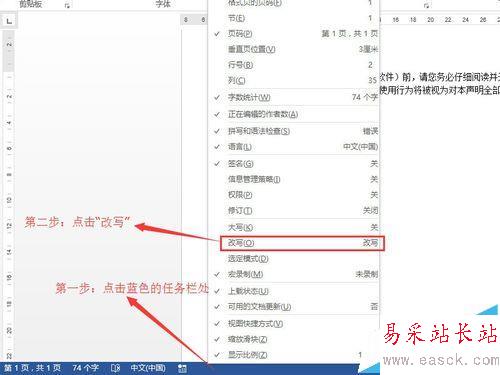 2、通過(guò)修改來(lái)讓狀態(tài)欄中顯示當(dāng)前的模式。首先在word2013底部的狀態(tài)欄中點(diǎn)擊右鍵。在彈出來(lái)的菜單點(diǎn)擊“改寫”。