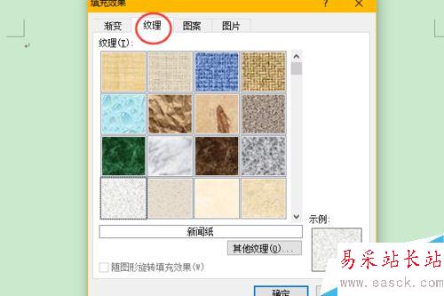 3、在彈出的填充效果對話框中我們選擇紋理頁簽,從中選擇一種紋理,將word背景變成一種類似墻紙的顏色。