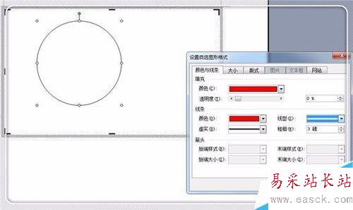 2、在“顏色與線條”標簽中,填充顏色選“無填充顏色”,線條顏色設為紅色,選3磅粗的單線形。