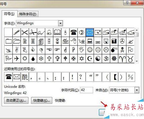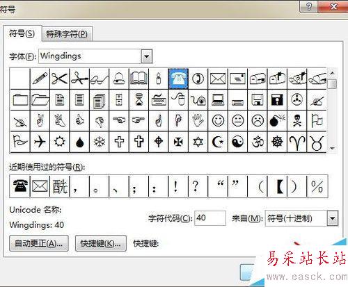 3、此時彈出“符號”對話框,在“字體”下拉列表框中選擇相應的符號類型如Wingdings。