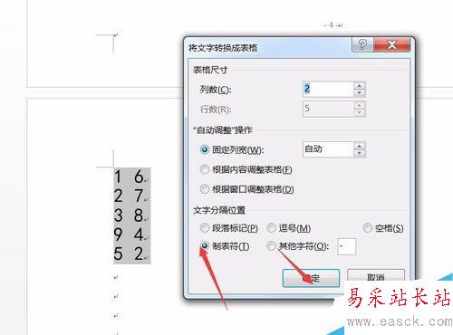 5、在彈出的“將文字轉換成表格”對話框中設置“列數”,然后選擇“制表符”。完成之后點“確定”。