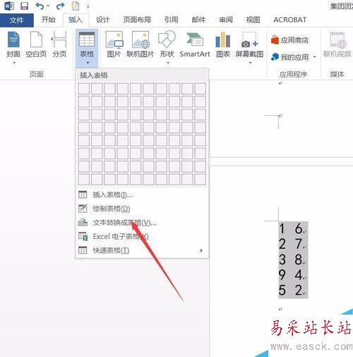 4、在彈出的下拉菜單中選擇“文本轉換成表格”。