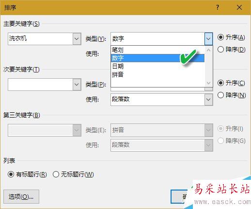 單擊“類型”下拉三角按鈕,在“類型”列表中選擇“數字”、“筆劃”、“日期”或“拼音”選項,以對應于標題字段的正確類型。這樣就可以按照需求選擇標題行的排序方式了。