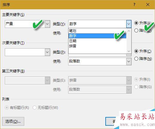 如果參與排序的是數字,例如“電器產量”,則要選擇“數字”選項。同時,還要注意選中“升序”或“降序”單選框設置排序的順序類型。如果參與排序的數據是日期類型,如“出廠時間”,則選擇“日期”選項才可以獲得正確的排序結果。