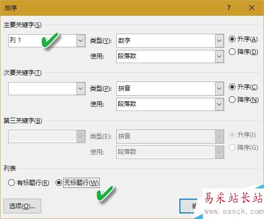 打開“排序”對話框,在“列表”區域選中“無標題行”單選框。這時主要關鍵字自動變為“列1”,點擊“確定”即可實現全體排序。