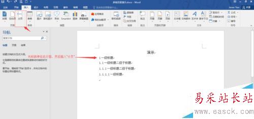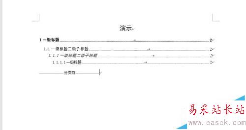 2、空出目錄位置。將光標停留在“1一級標題”的行首,然后插入“分頁”