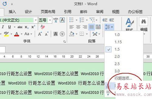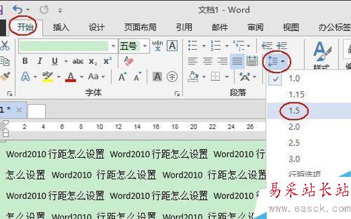 2、再單擊“開始”選項卡下的“行和段落間距”按鈕,選擇需要的數(shù)值即可: