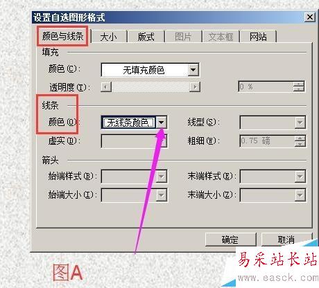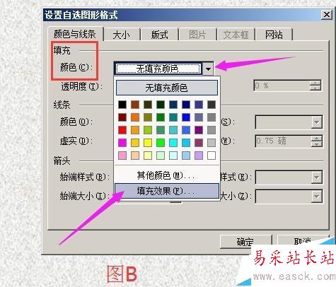4、雙擊立方體,彈出的“自選圖形格式”操作框;點開“線條與顏色”,然后,在“線條”顏色這里設置為“無線條顏色”,如圖A;點“填充顏色”右側(cè)的三角形,彈出的菜單中點“填充效果”,如圖B;