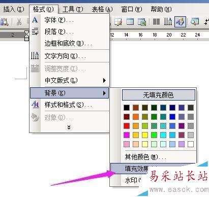 1、新建文檔,設置文檔的背景;在文檔上方的菜單欄中點“格式”,再點“背景”,再點“填充效果”;