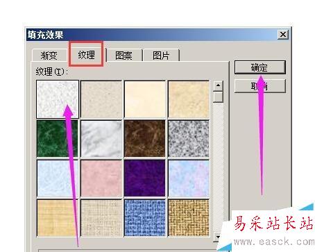 2、彈出的設置框中,點“紋理”;然后,在“紋理”這里點選第一種紋理,再點確定。文檔背景即設置好;