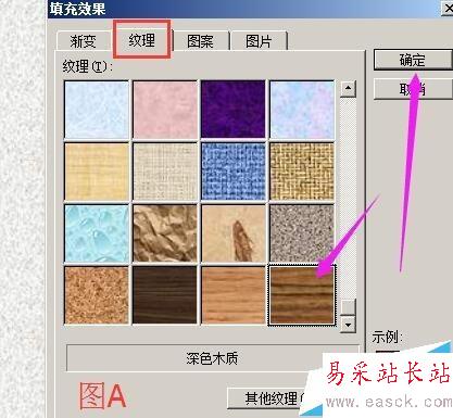 5、彈出“填充效果”設置框;點開“紋理”,點選“深色木質(zhì)”紋理,然后點確定,如圖A所示;轉(zhuǎn)回到“設置自選圖形格式”操作框,再點確定;立方體顏色填充效果如圖B所示;