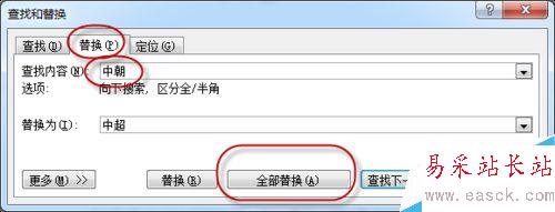 4、跳出“查找和替換”的對(duì)話框,在“替換”中“查找內(nèi)容”和“替換為”輸入相應(yīng)的字,再點(diǎn)擊“全部替換”;例,如圖