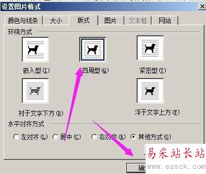 5、彈出的操作框內,點下”版式“,再點”四周型“,然后點確定,