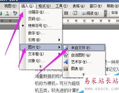 2、光標在插入圖片的位置點下,然后,在文檔上方的菜單欄中,順序點:插入--圖片--來自文件。