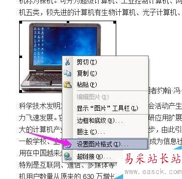 4、然后,調整圖片,光標在圖片上鼠標右鍵點下,彈出菜單中點”設置圖片格式“