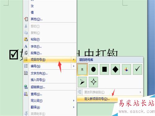 4、除了這種進入方法,你還可以右鍵點擊,出現(xiàn)右拉窗口,選擇項目符號-定義新項目符號。