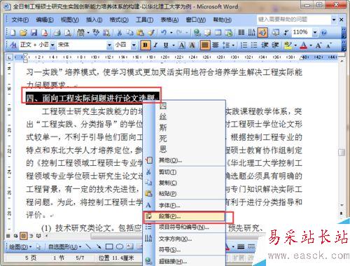 選中正文,點擊右鍵,選中“段落”,如圖所示;