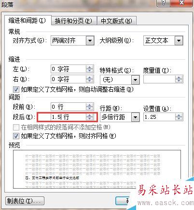 在跳出來的界面中,我們找到“段落”,“段后”,將其值配置為“1.5行”,如圖所示,然后點擊確定;