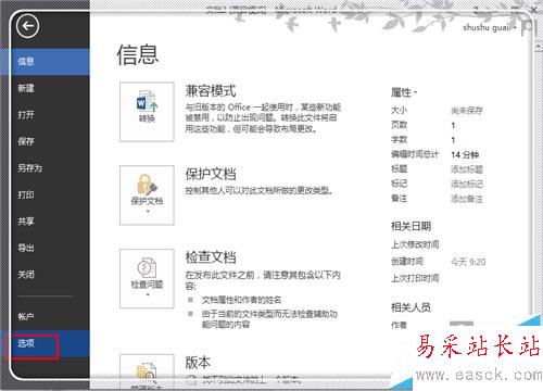 2、進入文件的欄目,點擊最下面的“選項”。