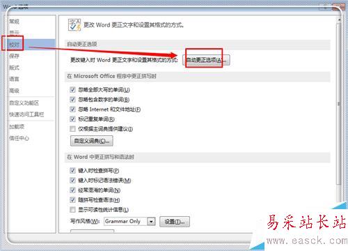 3、在選項中,點擊“校對”,然后點擊右邊的“自動更正選項”。
