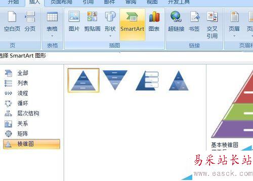 1、插入——SmartArt——棱錐圖——基本棱錐圖。