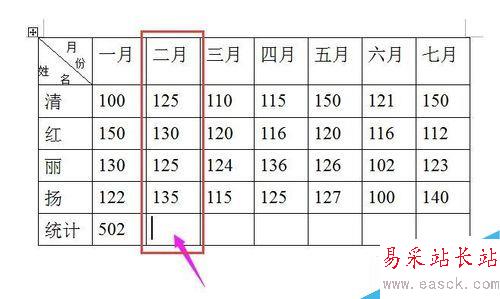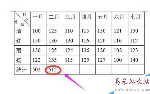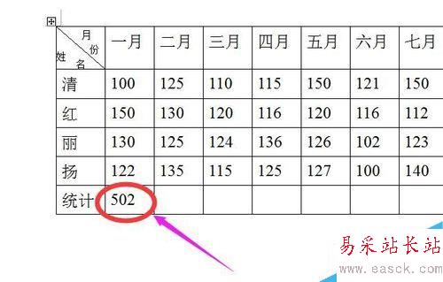 “502”是表格”一月“這一欄100+150+130+122的總數。