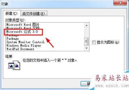 3、在“對象”窗口中,找到“Microsoft 公式3.0”,選擇后點確定。