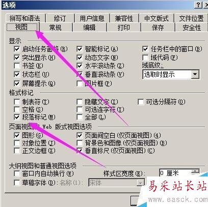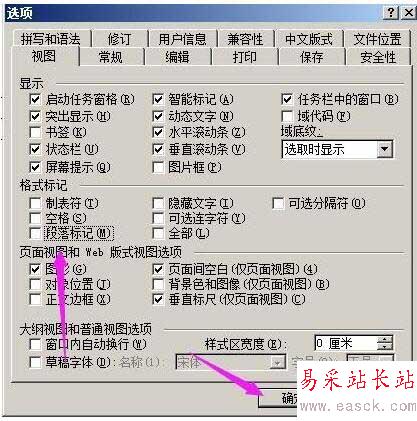2、點“選項”后,彈出的的設置框內,在“視圖”這一項中,在“段落標記”這里,把勾取消。然后,點確定。
