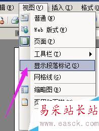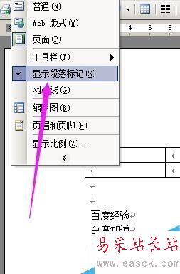 5、在彈出的下拉菜單中,看到“顯示段落標記”前面有個勾,然后,點下,表示取消顯示段落標記。文檔中的箭頭即消失。