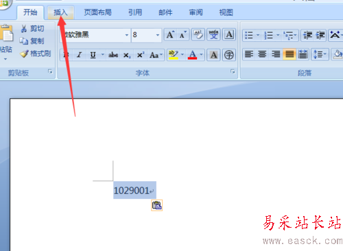 2、在word2007編輯界面中,輸入數(shù)字比如1029001,選中數(shù)字之后,點(diǎn)擊工具欄上插入按鈕