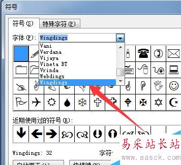 3、這地方的三角形里面包含了很多的種類,可以一個一個去打開看都不一樣,我這里選擇的圖案在wingdings里面,就選擇wingdings