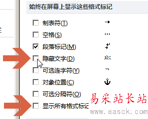 5、勾選“隱藏文字”或者“顯示所有格式標記”。如果勾選“顯示所有格式標記”,會將包括隱藏文字在內的所有其他word標記都顯示出來。