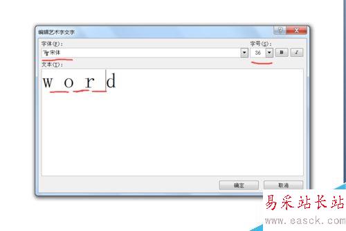 設(shè)置藝術(shù)字的大小,以及字體,在藝術(shù)字中間可以加入空格來使藝術(shù)字美觀。