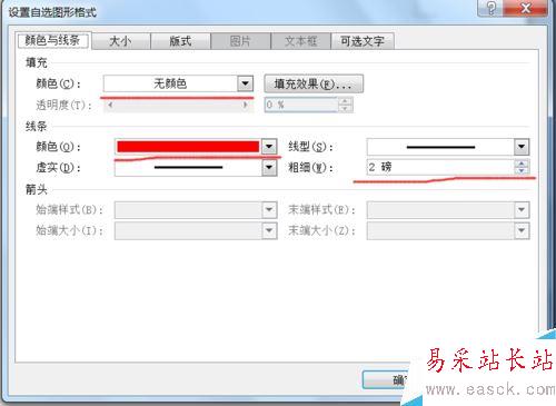 將填充顏色調(diào)整為無顏色線條顏色調(diào)整成紅色,線條粗細(xì)為2磅。
