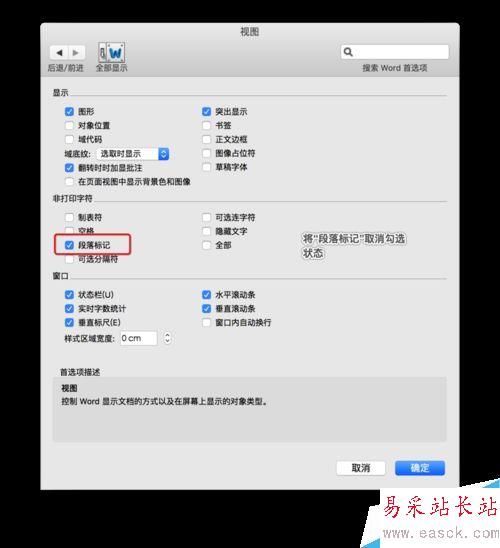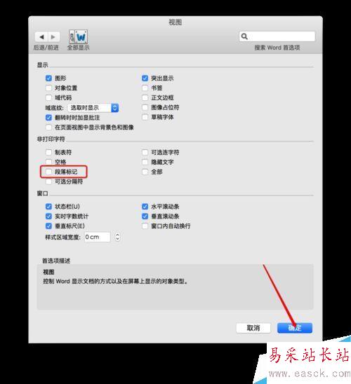 5、找到“段落標(biāo)記”,并將其設(shè)置為取消勾選狀態(tài),點擊確定;