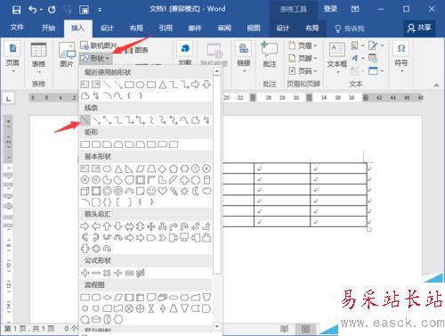 5、如果需要將單元格分為三欄或者多欄,再使用這類方法是行不通的。我們可以通過插入形狀的方法來完成。在插入菜單選項卡中,點擊“形狀”選項按鈕,在彈出的菜單選項框中選擇“直線”。如圖所示;