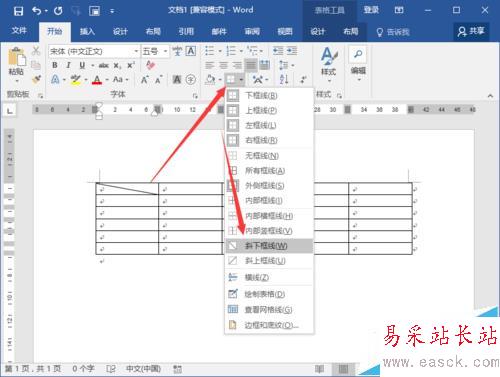 3、表格繪制完成后,選中需要繪制斜線表頭的單元格,然后再點擊設計選項卡下的邊框按鈕,在彈出的下來菜單中選擇斜下框線。如圖所示;