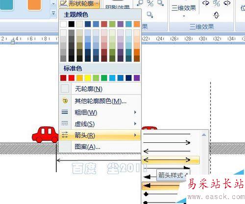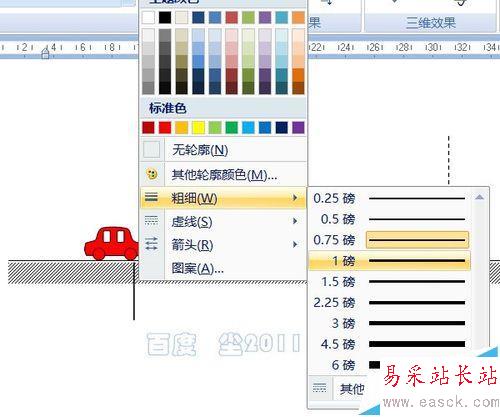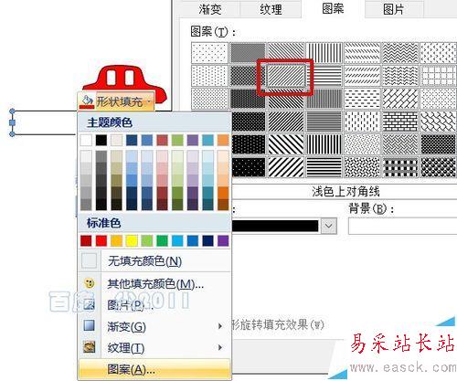 5、使用矩形工具在小車下畫一個窄長的矩形,并填充上斜線作為地面。填充斜線方法:繪圖工具——格式——形狀填充——圖案——淺色上對角線。
